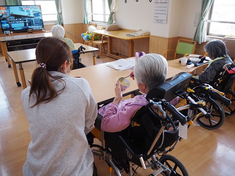 車椅子への移乗や声掛けの対応をしています。昼食時は必要に応じて食事介助も行います。