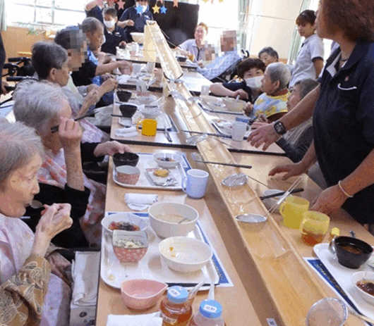 食堂まで利用者様をお連れして配膳を行い、見守りや食事介助をします。